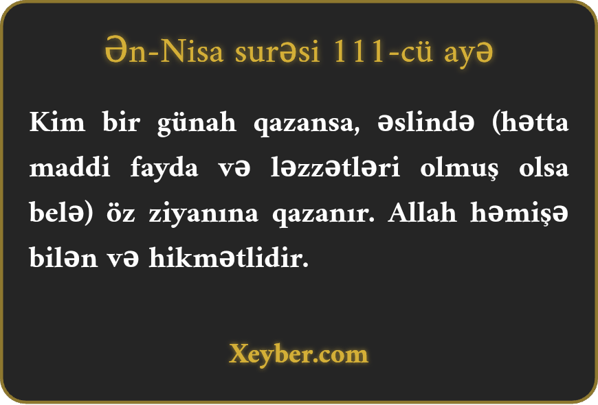 "Hər kəs günaha batsa, özünə ziyan etmişdir. Allah bilən və hikmət sahibidir.”