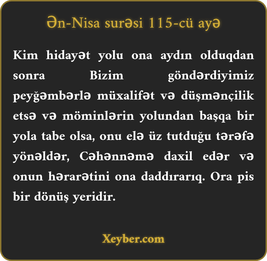"Hər kəsə doğru yol aşkar olduqdan sonra peyğəmbərlə müxalifətçilik etsə, onu üz tutduğu səmtə döndərərik. Onu pis bir sonluq olan cəhənnəmə atarıq.”
