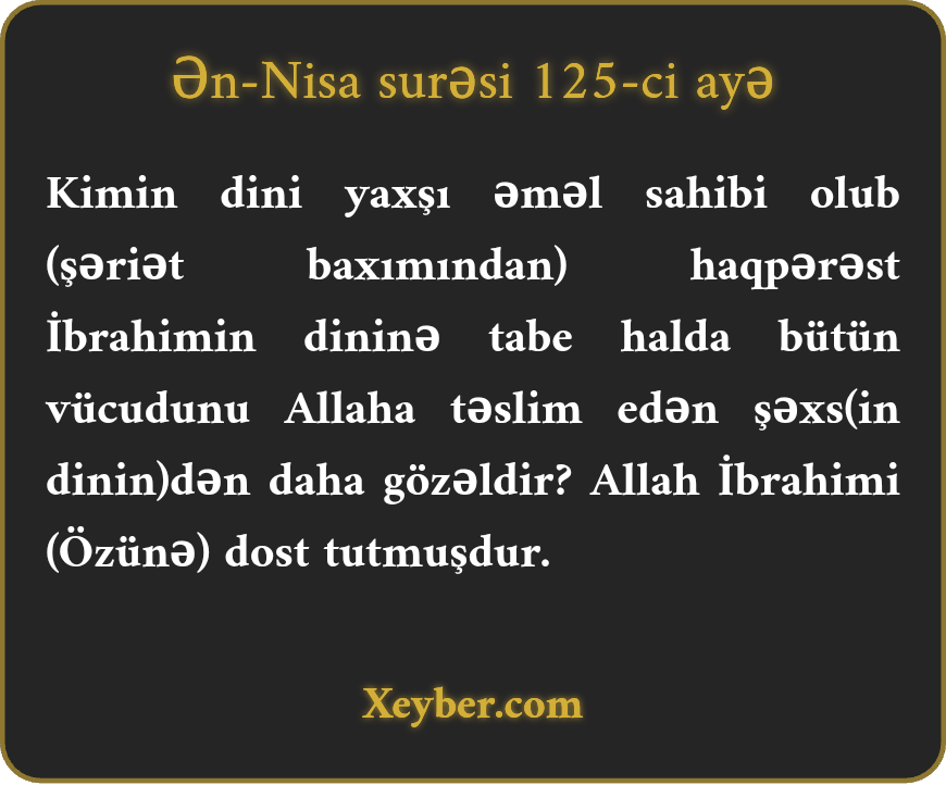 "Özü Allaha təslim olmuş, xeyir iş sahibi olduğu halda İbrahim ayininə tabe olan kəsin dinindən kimin dini üstündür?! Allah İbrahimi özünə dost seçdi.”