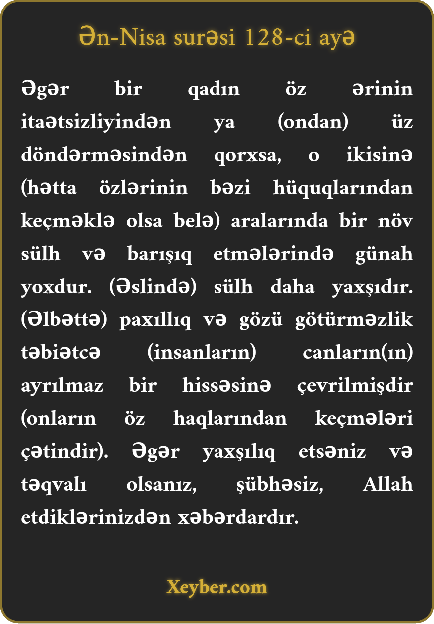 "Əgər qadın ərinin pis rəftarından və ya üz döndərməsindən qorxsa, bir yolla sülhə gəlmələri o iki nəfər üçün qorxulu deyil. (Hətta bəzi haqlara göz yumulsa da,) sülh üstündür. Amma xəsislik və dar baxış nəfslərdə hazırdır (sülhə mane olur). Əgər yaxşılıq etsəniz, təqvalı olsanız, bilin ki, həqiqətən, Allah etdiyiniz işdən agahdır.”