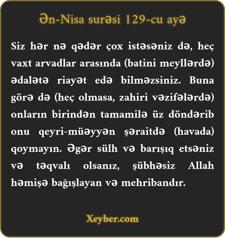 "(Qəlbən bağlılıqda) arvadlarınız arasında ədalətli rəftar edə bilməzsiniz. Nə qədər çalışsanız da, bu mümkün deyil. Beləsə, öz meylinizi daim bir tərəfə yönəltməyin ki, o biri tərəfi asılı vəziyyətdə (nə ərli kimi və nə boşanmış kimi boşanmış) qoyasınız. Əgər sülh, barışıq və təqva yolunu tutsanız, şübhəsiz, Allah daim bağışlayan və mehribandır.”