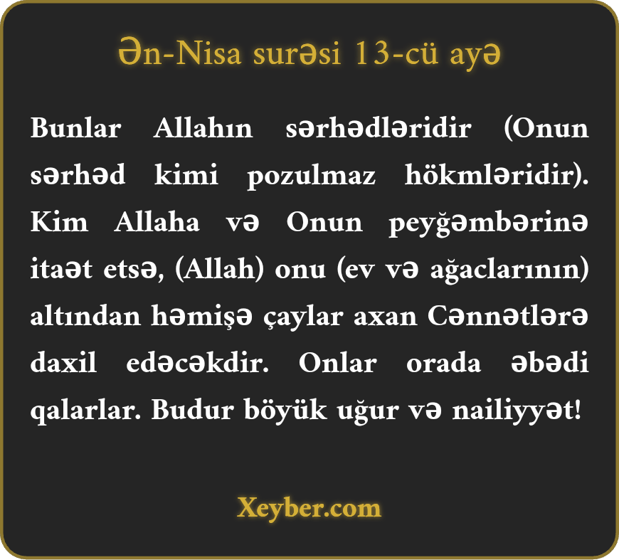 "O (deyilənlər,) ilahi hədlərdir. Hər kəs Allaha və Onun rəsuluna itaət etsə, (Allah onları) ağacları altından çaylar axan bağlara daxil edər. Onlar həmişə orada qalarlar. Budur böyük qurtuluş!”