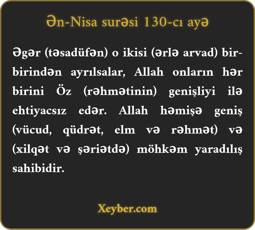 "Əgər onlar ikisi bir-birindən ayrılsalar, Allah onların hər birini Öz kərəm və vüsətindən ehtiyacsız edər. Allah daim açılış verəndir və hikmət sahibidir.”