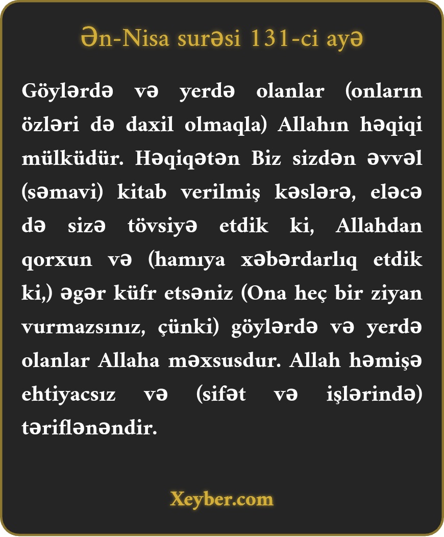 "Göylərdə və yerdə olan Allahındır. Həqiqətən, sizdən qabaq səmavi kitab verilənlərə və sizə də ilahi təqvanı sifariş etdik. Əgər kafir olsanız, göylərdə və yerdə olan Allahındır. Allah daim ehtiyacsızdır və sitayiş olunmuşdur.”