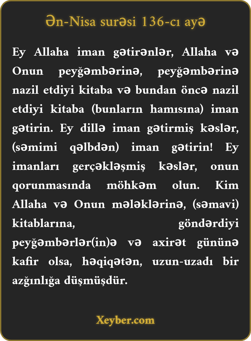 "Ey iman gətirənlər! Allaha, Onun peyğəmbərinə, peyğəmbərinə nazil etdiyi kitaba və daha əvvəllər nazil olunmuş kitaba (gerçəkdən) iman gətirin. Hər kəs Allaha, mələklərə, səmavi kitablara, peyğəmbərlərə və qiyamət gününə küfr etsə, həqiqətən, azmışdır. Uzun-uzadı bir azğınlıq!”