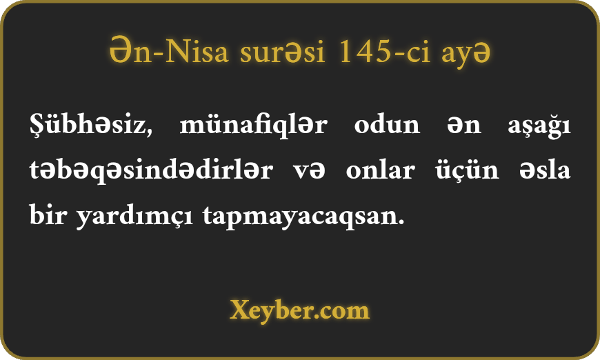 "Şübhəsiz, münafiqlər odun (cəhənnəmin) ən aşağı dərinliyindədirlər. Onlar üçün heç vaxt heç bir köməkçi tapmazsan.”