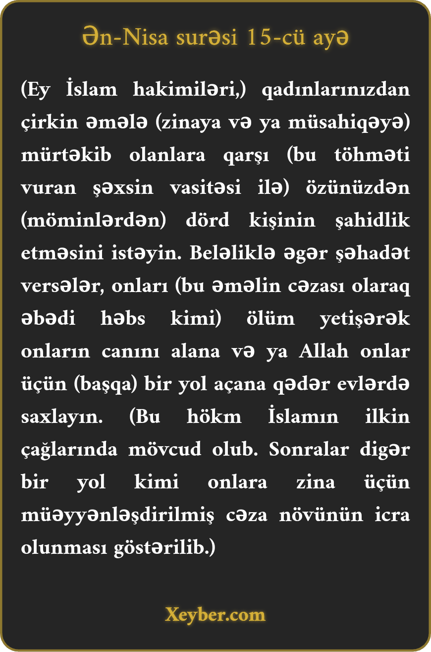 "Qadınlarınızdan zinaya yol verənlər üçün öz aranızdan dörd şahid tutun. Əgər şəhadət verdilərsə, həmin qadınları evlərində ya ölənədək, ya da Allah onlar üçün bir yol açanadək saxlayın.”