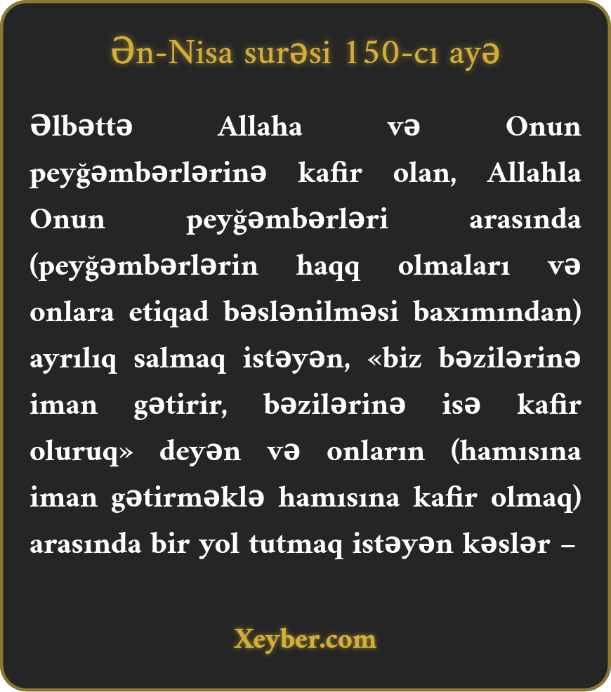 "Şübhəsiz, Allaha və Onun rəsullarına küfr edən, Allahla Onun peyğəmbərləri arasında ayrılıq salmağa çalışan və "bəzi şeyə iman gətirdik, bəzisinə yox” deyən kəslər bu arada yol tutmaq istəyirlər. (Ağıl və düşüncəyə yox, nəfs istəklərinə uyğun yol)