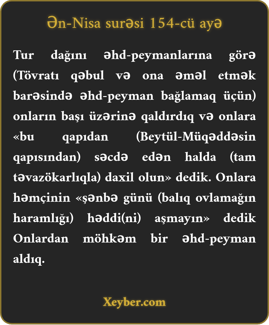"Biz Tur dağını onlardan (Bəni-İsraildən) əhd almağa xatir başlarının üzərində qərar verdik və onlara dedik: «Səcdə edən halda o qapıdan daxil olun.» Sonra dedik: «Şənbə günü (Allahın hökmlərini) pozmayın.» Onlardan möhkəm əhd aldıq.”