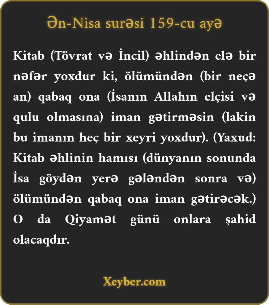 "Kitab əhlindən elə bir kəs yoxdur ki, ölümündən qabaq ona (İsaya) iman gətirməsin. Qiyamət günü o həmin kəslərə şahid olacaq.”