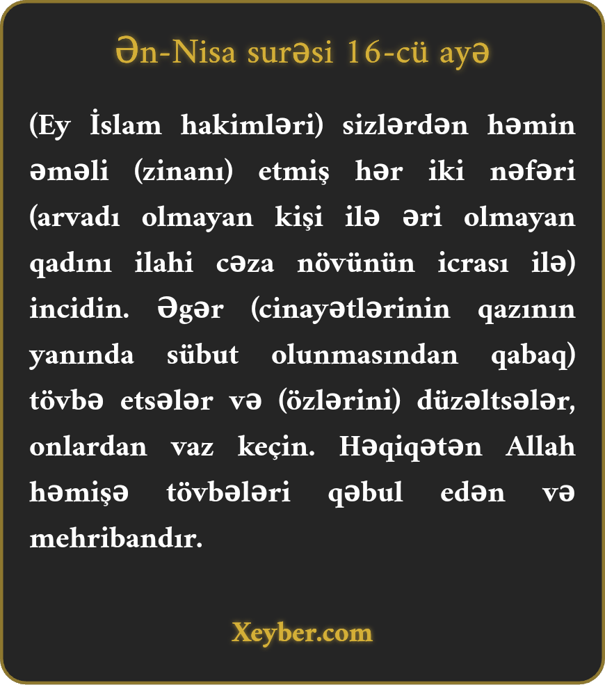 "Sizlərdən günah və zina ardınca gedən hər iki nəfərə əziyyət verin (onlara hədd təyin edin). Əgər tövbə edib, islah olsalar, onları bağışlayın, (çünki) Allah tövbələri qəbul edən və mehribandır.”