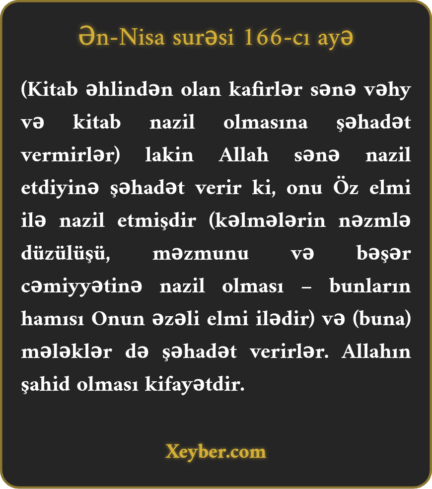 "(Kafirlər bəhanə gətirirlər) Amma Allah sənə nazil etdiyi barədə şəhadət verir ki, Öz elmi ilə sənə nazil etdi. Mələklər də (sənin haqq olmağına.) Şəhadət verirlər. Allahın şahidliyi (sənin üçün) kafidir.
