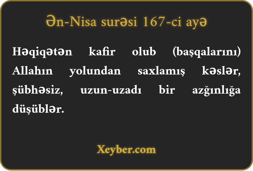 "Şübhəsiz, kafir olub (şübhə, böhtan, təhqir təlqini ilə) xalqı Allahın yolundan kənarlaşdıran kəslər azdılar. (Qurtuluşdan) uzaq bir azğınlıq!”