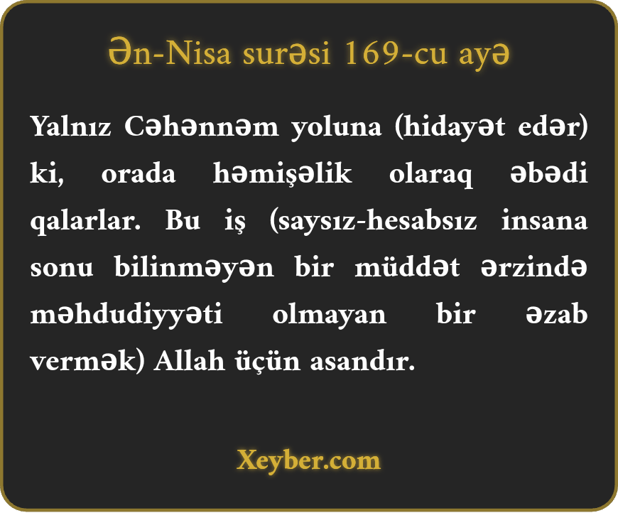 "Yalnız cəhənnəmin yoluna (yönəldilərlər) və həmişəlik onda qalandırlar. Bu (əzab) Allah üçün asandır.”