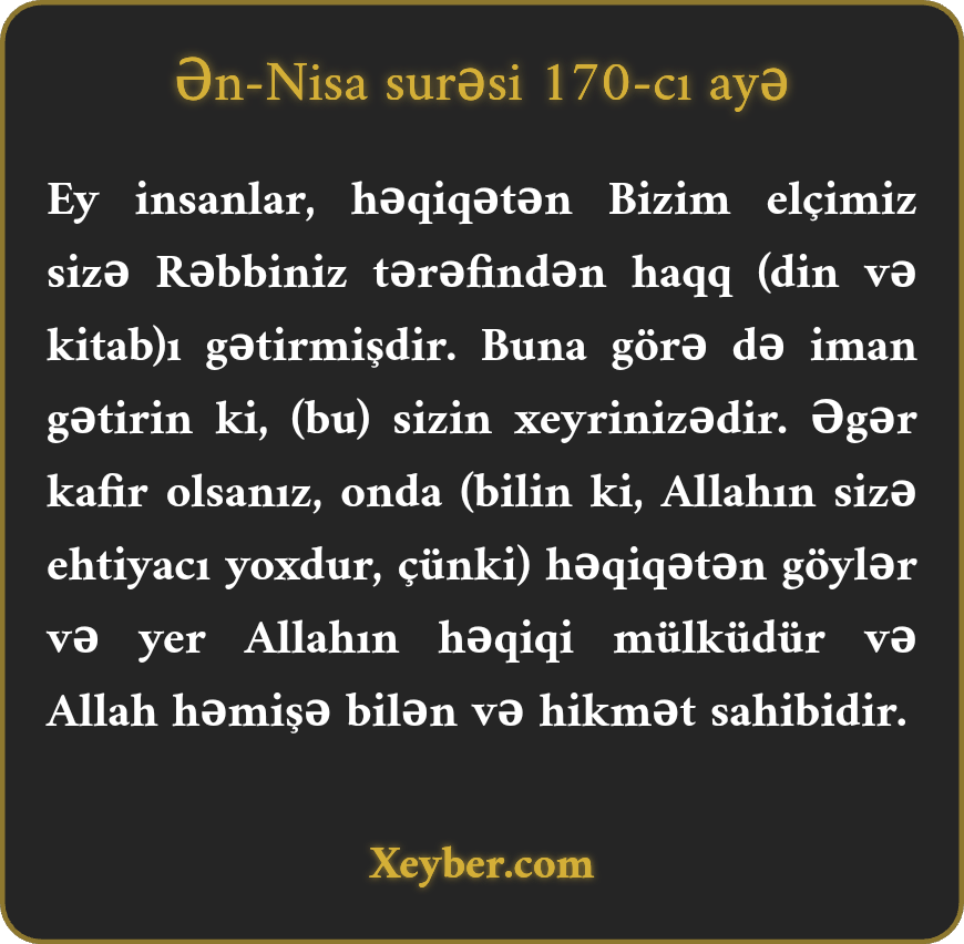 "Ey xalq! Həqiqətən, peyğəmbər sizin Allahınız tərəfindən haqla (Quranla) birgə gəlmişdir. İman gətirin, bu sizin üçün daha yaxşıdır. Əgər (naşükürlük edib küfrə uğrasanız bilin ki), göylərdə və yerdə nə varsa Allahındır. Allah biləndir və hikmət sahibidir.”