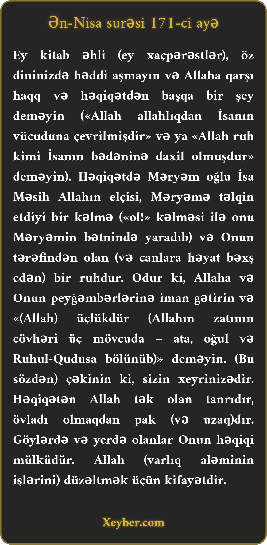 "Ey kitab əhli! Öz dininizdə həddi aşmayın və yalnız haqqı Allaha aid edin. Həqiqətən, Məsih, Məryəm oğlu İsa Allahın Məryəmə yetirdiyi elçi və onun kəlməsidir. İsa Allah tərəfindən bir ruhdur. Belədirsə, Allaha və Onun rəsuluna iman gətirin. Üç üqnuma inanmayın. (Bu sözdən) əl götürün, bu, sizin faydanızadır. Allah bir olan məbuddur və övladı olmaq sifətindən pakdır. Haqq yalnız budur. Səmalarda və yerdə nə varsa Onundur. Varlıq aləmində tədbir və rəhbərlik üçün Allah yetər.”