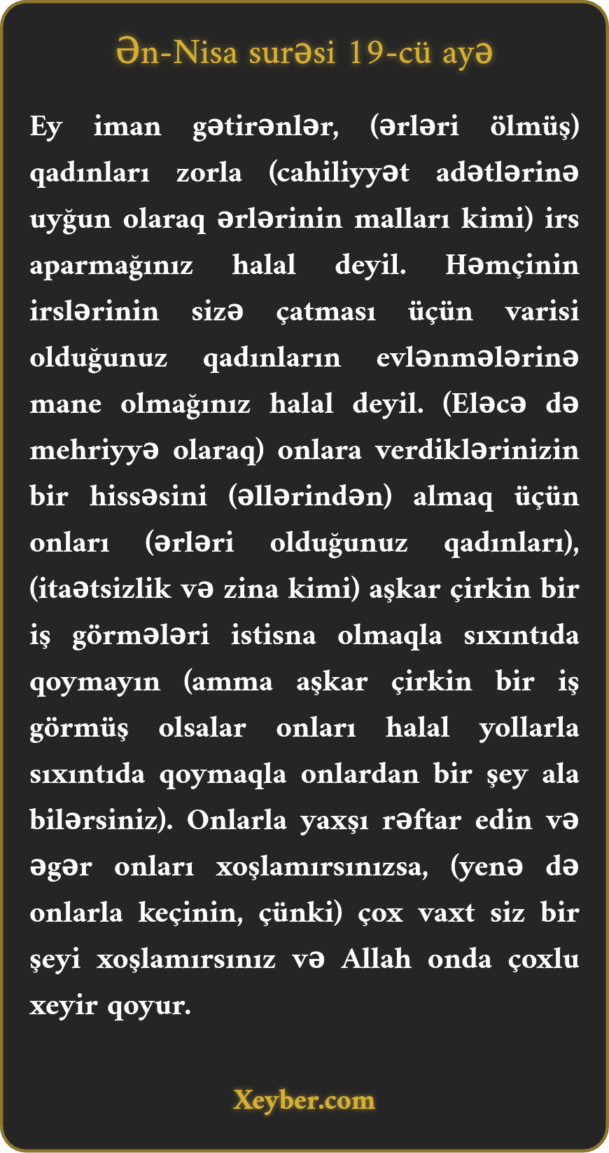 "Ey iman gətirənlər! Qadınlardan zorla irs almaq sizə halal deyil. Aşkar günaha batmayınca bağışladığınızın bir hissəsini almaq üçün onlara çətinlik yaratmayın. Onlarla yaxşılıqla rəftar edin. Əgər onlardan xoşunuz gəlməsə, çox olsun ki, siz bir şeyi xoşlamayasınız, amma Allah həmin şeydə böyük xeyir qoymuş olsun.”