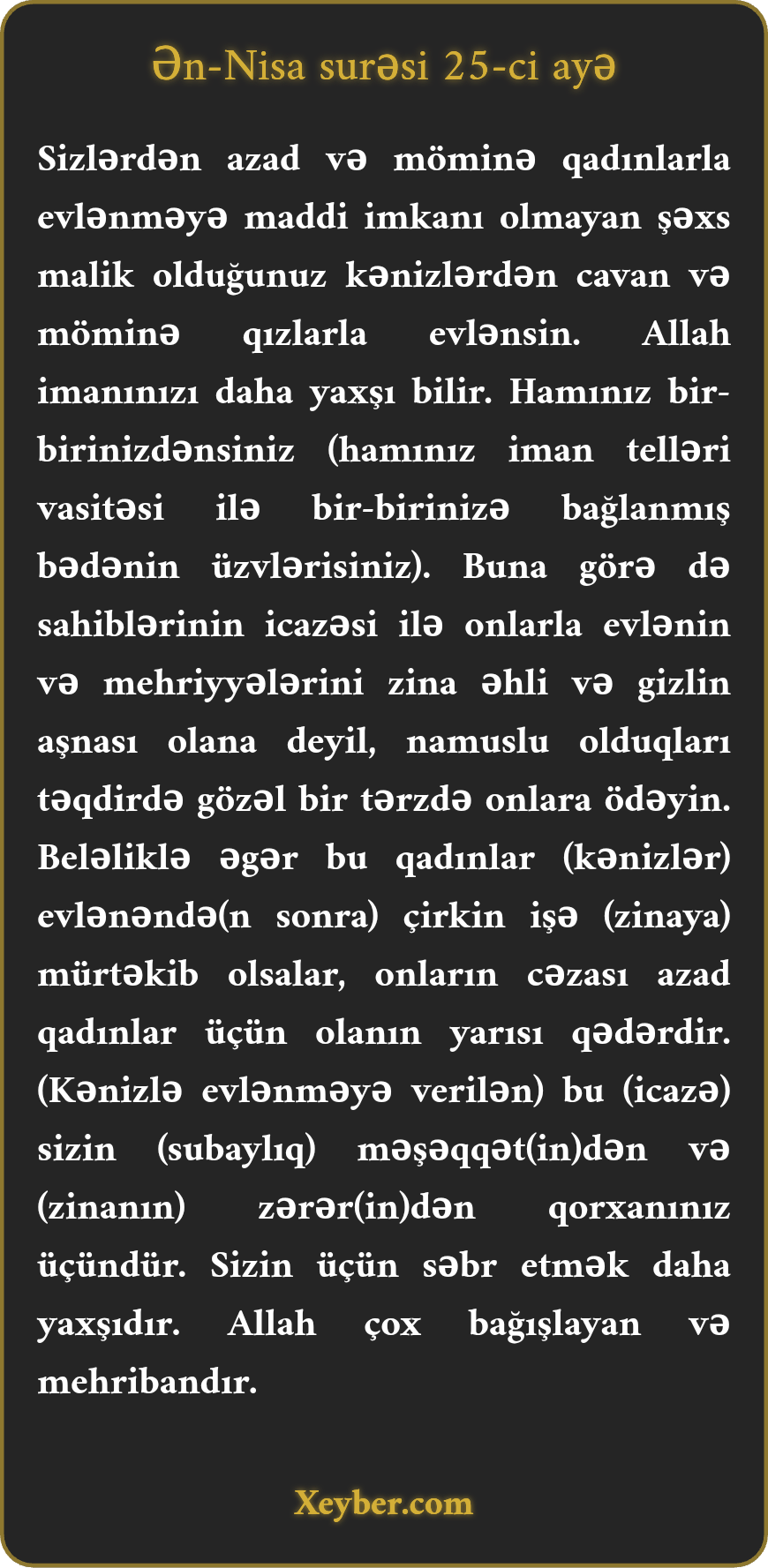"İmanlı azad qadınlarla evlənməyə maddi imkanı çatmayanlarınız maliki olduğu imanlı kənizlərlə (evlənə bilər). Allah sizin imanınızı daha yaxşı bilir. Hamınız bir-birinizdənsiniz (azad olduğunuz üçün özünüzü kənizlərdən üstün saymayın) Sahiblərinin izni ilə kənizlərlə evlənin, onlara yaxşı və layiqli mehriyyə verin. Bir şərtlə ki, onlar pak olsunlar, zinakarlıq etməsinlər, gizlində aşna tutmasınlar. Ərə getmiş kənizlər zinaya yol verdikdə onların cəzası azad qadınların cəzasının yarısı qədərdir. Bu, günah və zinaya düşməkdən qorxanlarınız üçündür. Bununla belə, səbir etmək (kənizlərlə evlənməmək) sizin üçün daha yaxşıdır. Allah bağışlayan və mehribandır.”