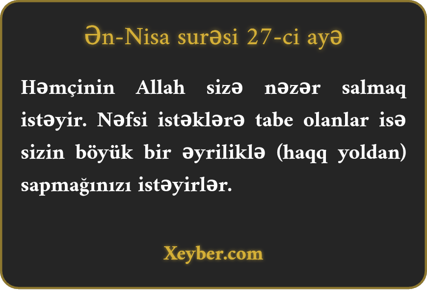 "Allah sizi bağışlamaq (çirkinliyinizi təmizləmək) istəyir. Amma nəfsinə itaət edənlər sizi böyük azğınlığa sövq etdirmək istəyirlər.”