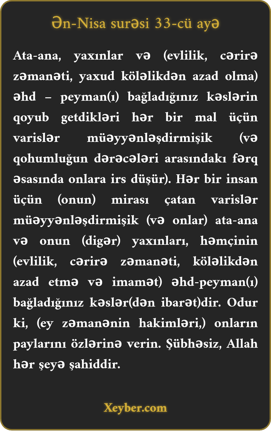 "Ata-ana, qohumlar və peyman bağladığınız kəslərdən qalan şeylərin hər biri üçün varislər qərar vermişik. Onların payını ödəyin. Çünki Allah hər şeyə şahiddir.”