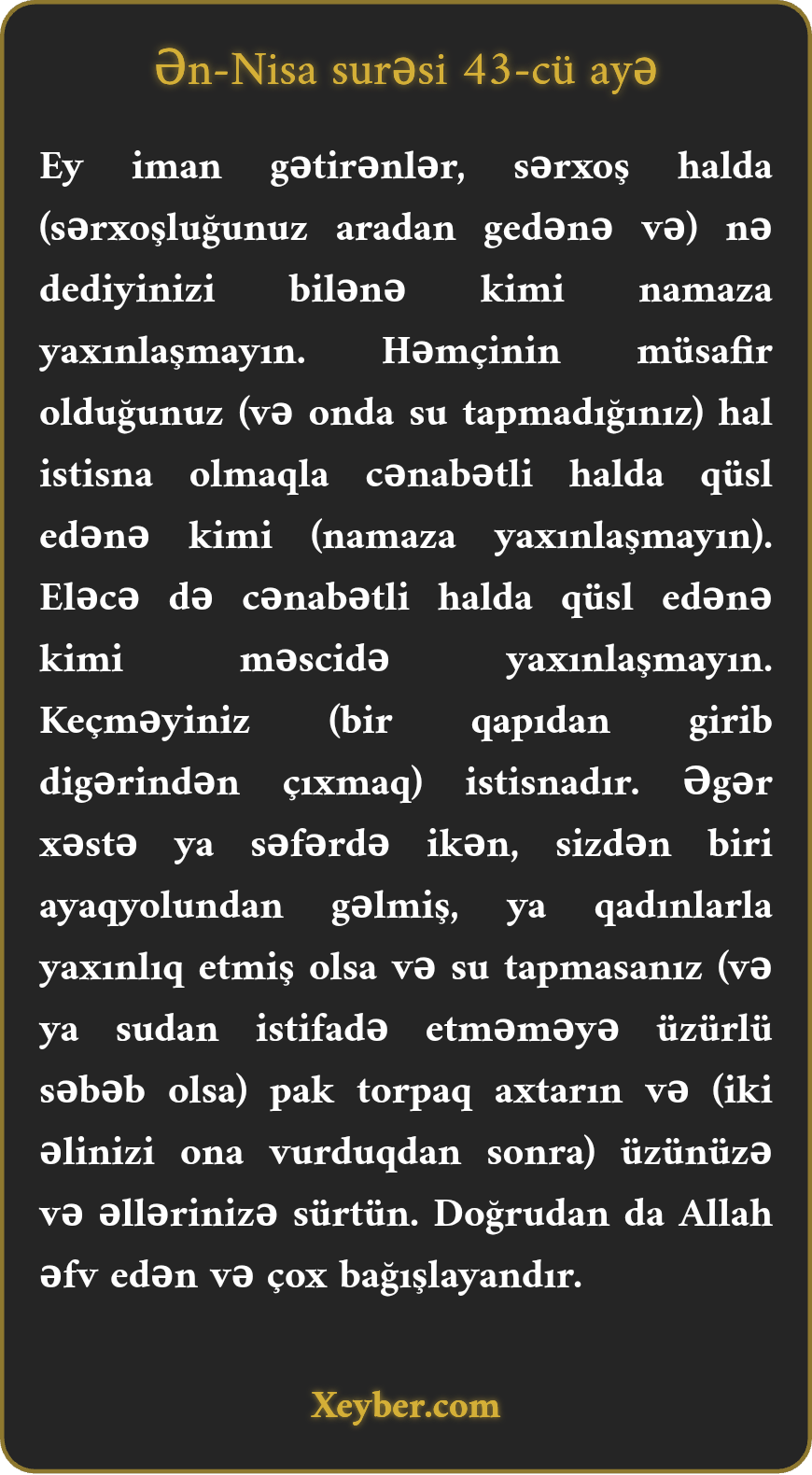 "Ey iman gətirənlər! Məst halda namaza yaxınlaşmayın, o vaxta qədər ki, dediyinizi biləsiniz. Eləcə də, cünub halda (zəruri qüslü verməmiş) namaza yaxınlaşmayın. Qüsl edənədək yalnız (məsciddə dayanmadan) ötüb keçə bilərsiniz. Əgər xəstələnsəniz və ya səfərdə olsanız, ya da biriniz dərədən (ayaq yolundan) gəlsəniz, ya qadınlarla təmasda olsanız, (bu hallarda) su tapmasanız pak və xoşagələn yerə (torpağa) təyəmmüm edin. (İki ovcunuzu torpağa vurun), üzünüzə və əllərinizə məsh çəkin. Həqiqətən, Allah bağışlayan və mehribandır.”