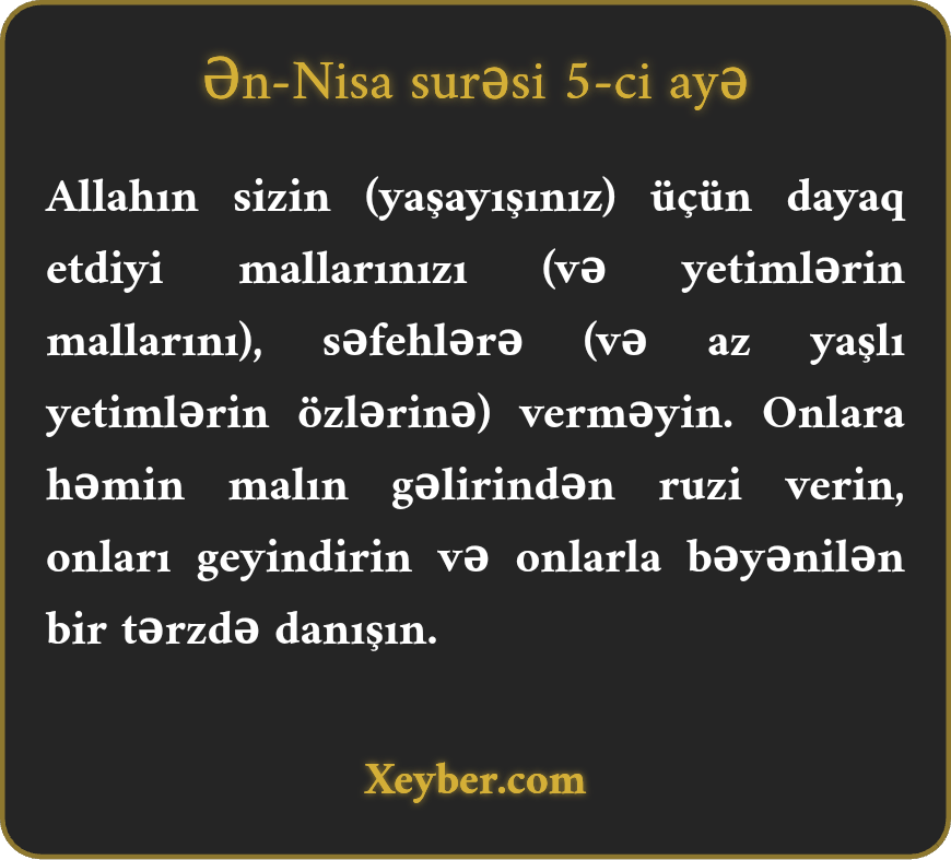 "Həyatınızın qurulması üçün Allahın vasitə qərar verdiyi mallarınızı səfehlərin əlinə verməyin. Amma onun gəlirindən həmin adamları yedirin, xərclərini verin, geyindirin və onlarla xoş danışın.”