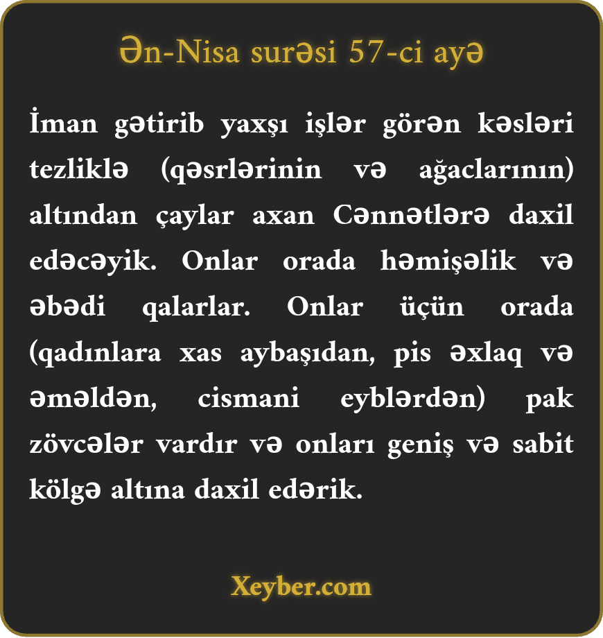 "İman gətirib yaxşı işlər görənləri tezliklə altından çaylar axan bağlara daxil edərik. Onlar orada əbədi qalarlar. Orada onlar üçün pak zövcələr var. Onları daimi kölgələrə daxil edərik.”
