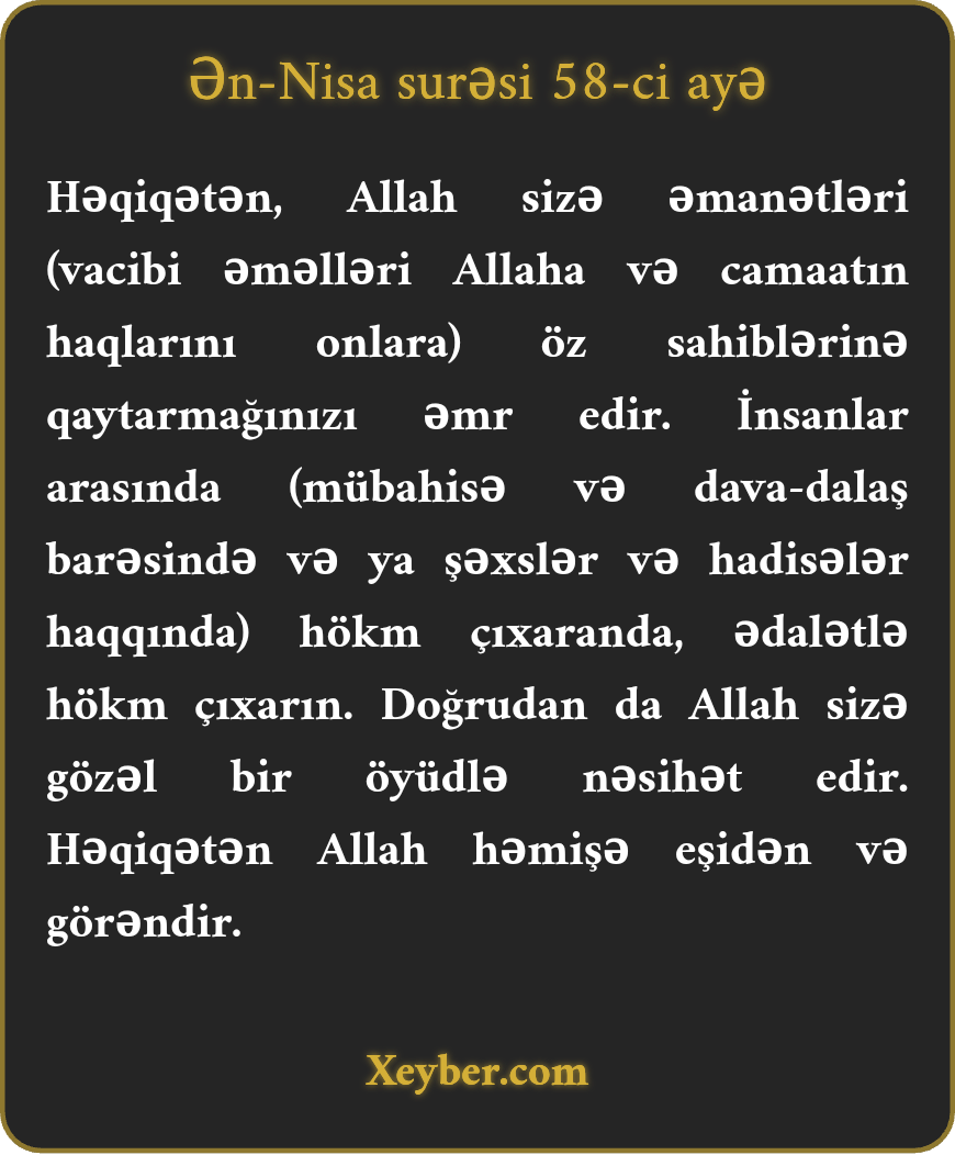 "Həqiqətən, Allah sizə əmr edir ki, əmanətləri sahiblərinə qaytarın. Xalq arasında hakimlik edərkən ədalətlə hökm verin. Allahın sizə öyüd verdiyi şey necə də yaxşıdır! Şübhəsiz, Allah eşidən və görəndir.”