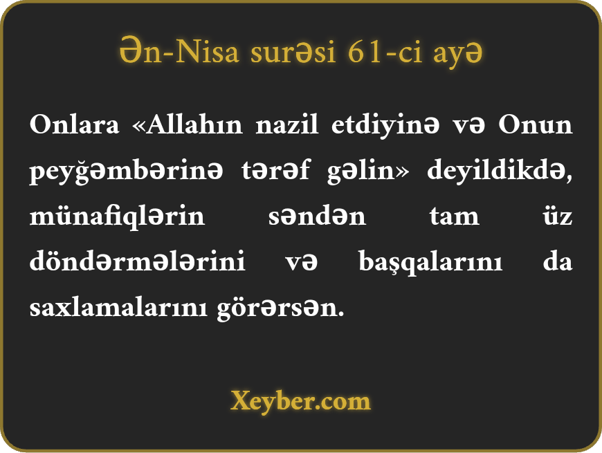 "Onlara "(mühakimə üçün) Allahın nazil etdiyinə və peyğəmbərə doğru gəlin” deyildikdə, görərsən ki, bu münafiqlər sənin dəvətinin qəbulundan şiddətlə üz döndərirlər.”