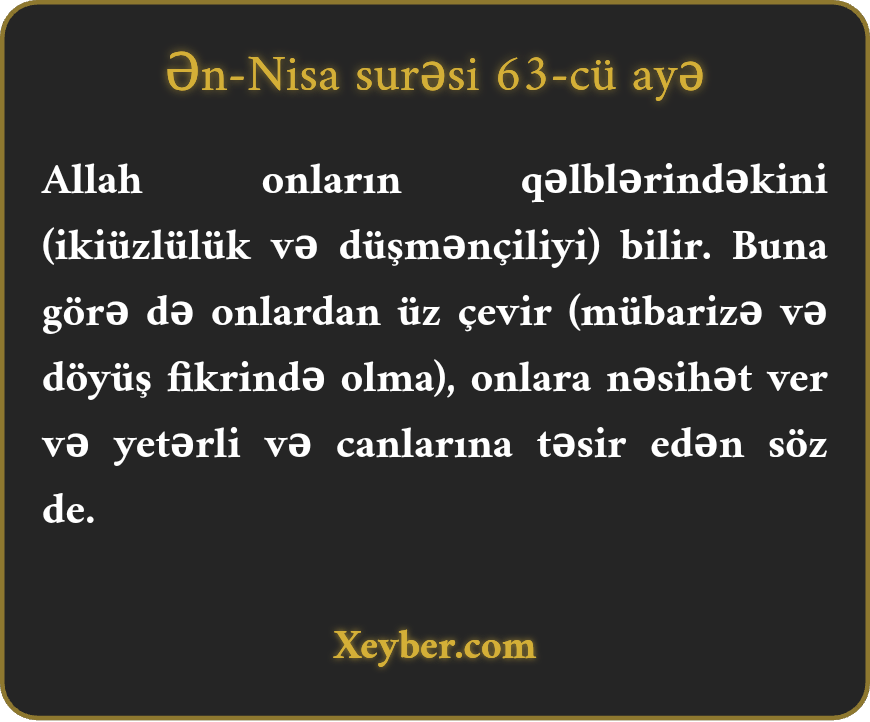 "Onlar qəlblərindəkini Allah bilən kəslərdir. Onlardan üz döndər (keç), onlara öyüd ver və onlarla qəlblərinə yatan yetərli söhbətlər et.”