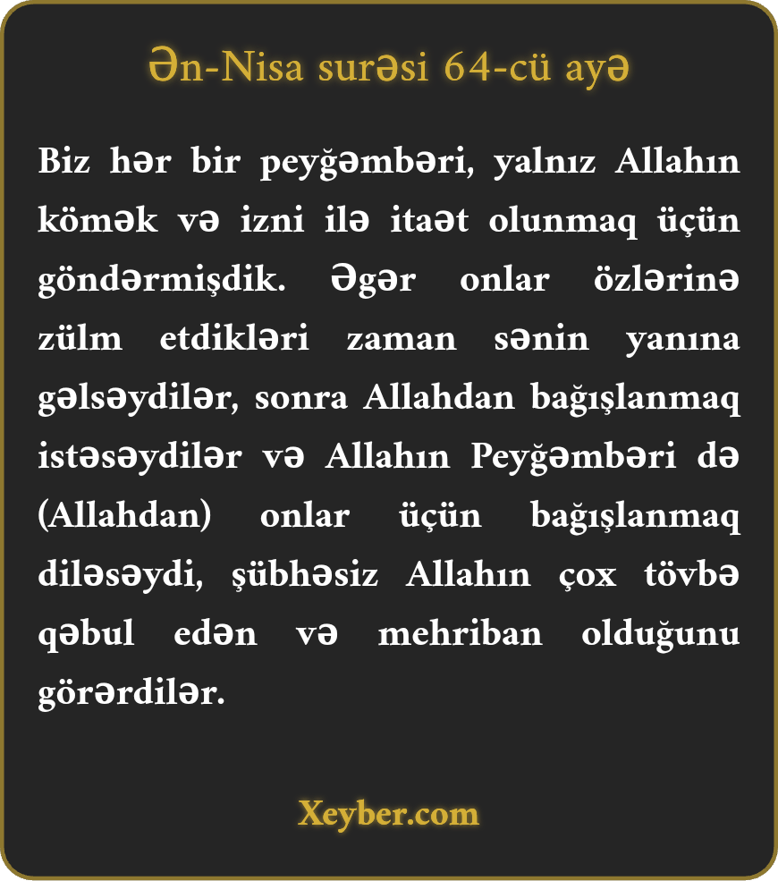 "Biz bütün peyğəmbərləri yalnız Allahın izni ilə itaət üçün göndərdik. Onlar özlərinə zülm etdikləri vaxt sənin yanına gəlsəydilər və Allahdan bağışlanmaq diləsəydilər, peyğəmbər də onlar üçün bağışlanma istəsəydi, şübhəsiz, Allahın tövbələri qəbul edən və mehriban olduğunu görərdilər.”