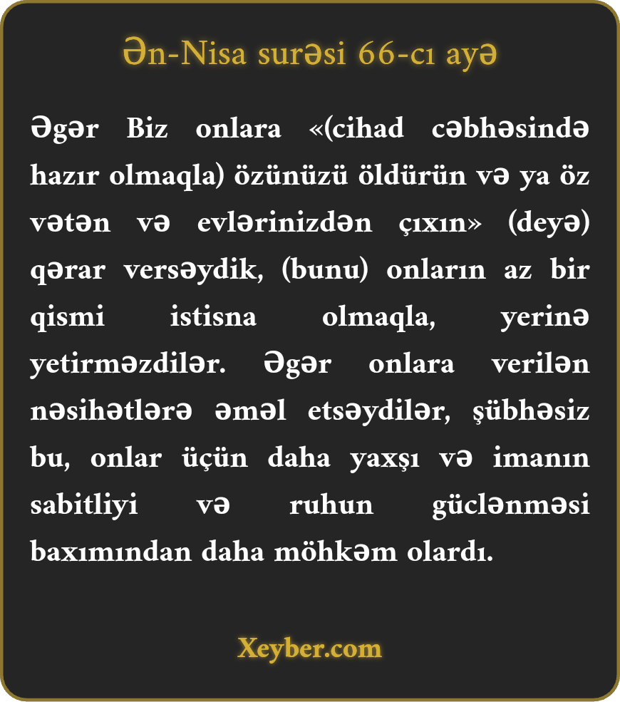 "Əgər onlara hökm etsəydik ki, ölümə getsinlər (Bizim əmrimizlə bir-birlərini öldürsünlər), evlərindən və məmləkətlərindən çıxsınlar, kiçik bir hissəsi istisna olmaqla bu göstərişi yerinə yetirməzdilər. Əgər onlar öyüd verilən şeyə əməl etsəydilər, onlar üçün üstün və möhkəmlikdə təsirli olardı.”