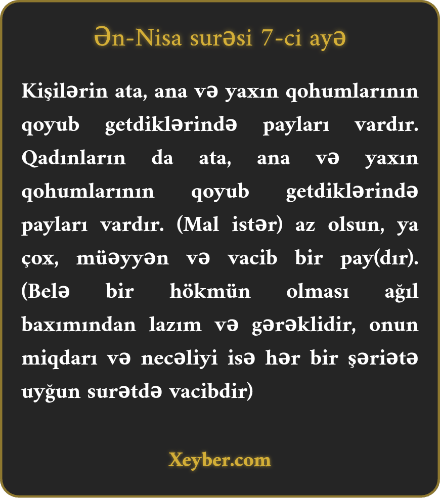 "Kişilər üçün ata-ana və qohumlardan qalandan pay var. Qadınlar üçün (də) ata-ana və qohumlardan qalandan pay var. İstər az olsun, istər çox, bir pay müəyyəndir.”