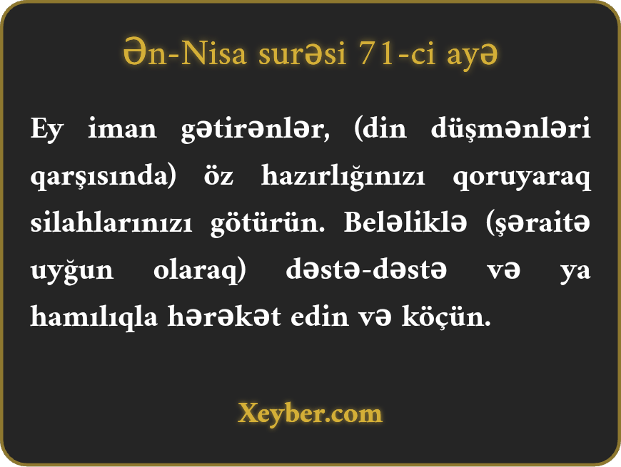 "Ey iman gətirənlər! (Düşmən qarşısında ayıq olun və hazırlıq əlaməti olaraq) silahınızı götürün. Ayrı-ayrı, nizamsız dəstələr şəklində və ya birlikdə düşmənə doğru hərəkət edin.”