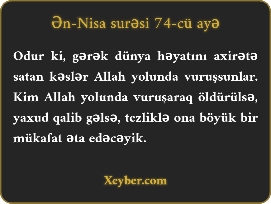 "Allah yolunda o kəslər döyüşə qalxmalıdırlar ki, dünya həyatını axirət həyatına satmışlar və Allah yolunda vuruşub öldürülən və ya qalib gələn kəsə tezliklə böyük mükafat verəcəyik.”