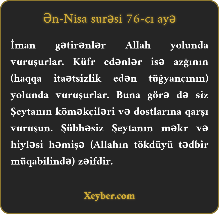 "İman gətirənlər Allahın yolunda cihad edirlər. Kafir olanlar isə tağut yolunda döyüşürlər. Beləcə, şeytanın dostları və köməkçiləri ilə döyüşün (və qorxmayın), çünki şeytanın hiyləsi zəifdir.”