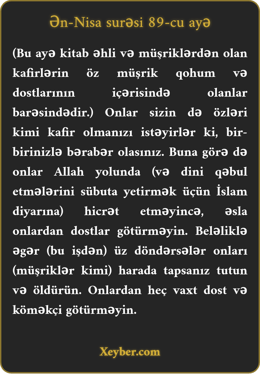 "Onlar (münafiqlər) sizin də onlarla bərabər kafir olmağınızı istəyirlər. Nə qədər ki, (tövbə və) Allah yolunda hicrət etməyiblər, onları dost tutmayın. Əgər boyun qaçırsalar (kafirlərlə həmkarlıqlarını davam etdirsələr), onları harada tapsanız öldürün. Onlardan heç bir dost və yardımçı tutmayın.”