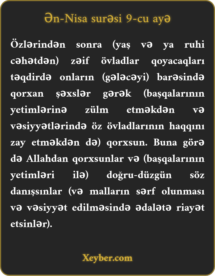 "Özündən sonra zəif övladlar qoyan və onlar üçün qorxan kəslər (xalqın yetimlərinə qarşı zülmdən də) qorxmalıdırlar. Allahdan çəkinsinlər və möhkəm söz danışsınlar.”