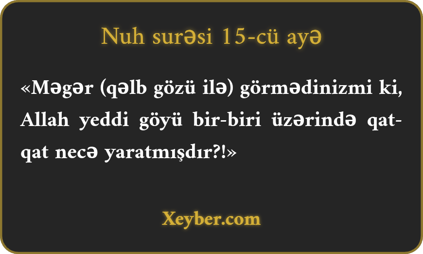 «Məgər (qəlb gözü ilə) görmədinizmi ki, Allah yeddi göyü bir-biri üzərində qat-qat necə yaratmışdır?!»