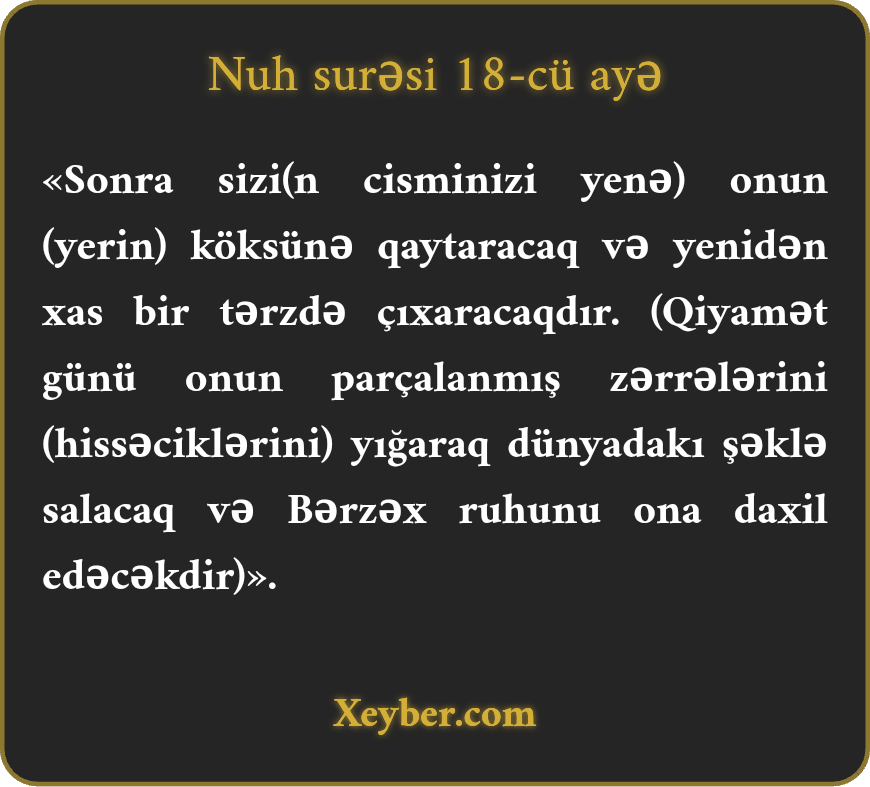 «Sonra sizi(n cisminizi yenə) onun (yerin) köksünə qaytaracaq və yenidən xas bir tərzdə çıxaracaqdır. (hissəciklərini">(Qiyamət günü onun parçalanmış zərrələrini (hissəciklərini) yığaraq dünyadakı şəklə salacaq və Bərzəx ruhunu ona daxil edəcəkdir)».