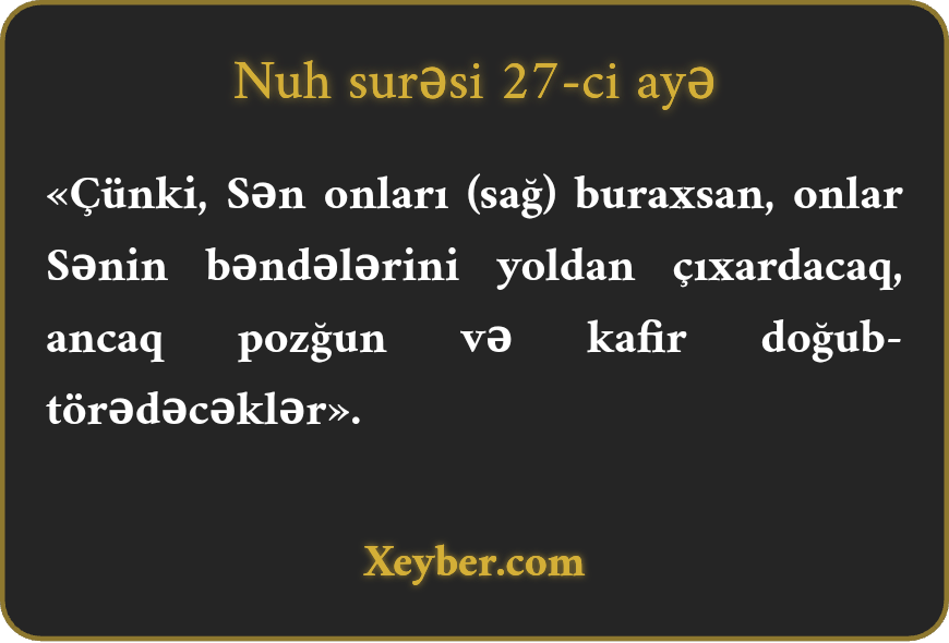 «Çünki, Sən onları (sağ) buraxsan, onlar Sənin bəndələrini yoldan çıxardacaq, ancaq pozğun və kafir doğub-törədəcəklər».