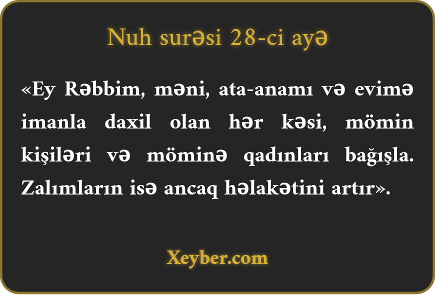 «Ey Rəbbim, məni, ata-anamı və evimə imanla daxil olan hər kəsi, mömin kişiləri və möminə qadınları bağışla. Zalımların isə ancaq həlakətini artır».