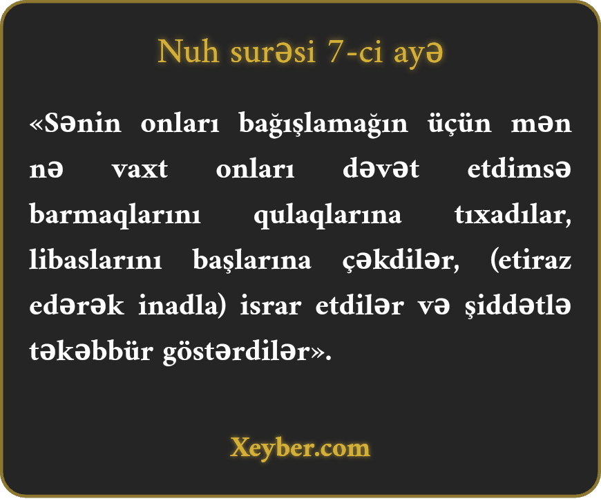 «Sənin onları bağışlamağın üçün mən nə vaxt onları dəvət etdimsə barmaqlarını qulaqlarına tıxadılar, libaslarını başlarına çəkdilər, (etiraz edərək inadla) israr etdilər və şiddətlə təkəbbür göstərdilər».