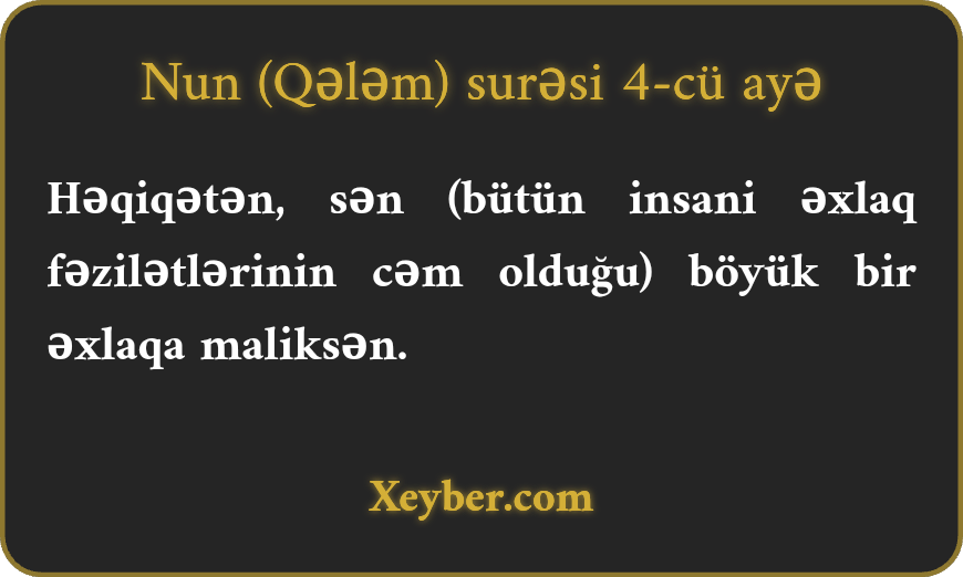 Həqiqətən, sən (bütün insani əxlaq fəzilətlərinin cəm olduğu) böyük bir əxlaqa maliksən.
