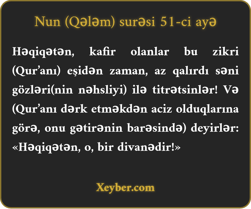 Həqiqətən, kafir olanlar bu zikri (Qur’anı) eşidən zaman, az qalırdı səni gözləri(nin nəhsliyi) ilə titrətsinlər! Və (Qur’anı dərk etməkdən aciz olduqlarına görə, onu gətirənin barəsində) deyirlər: «Həqiqətən, o, bir divanədir!»
