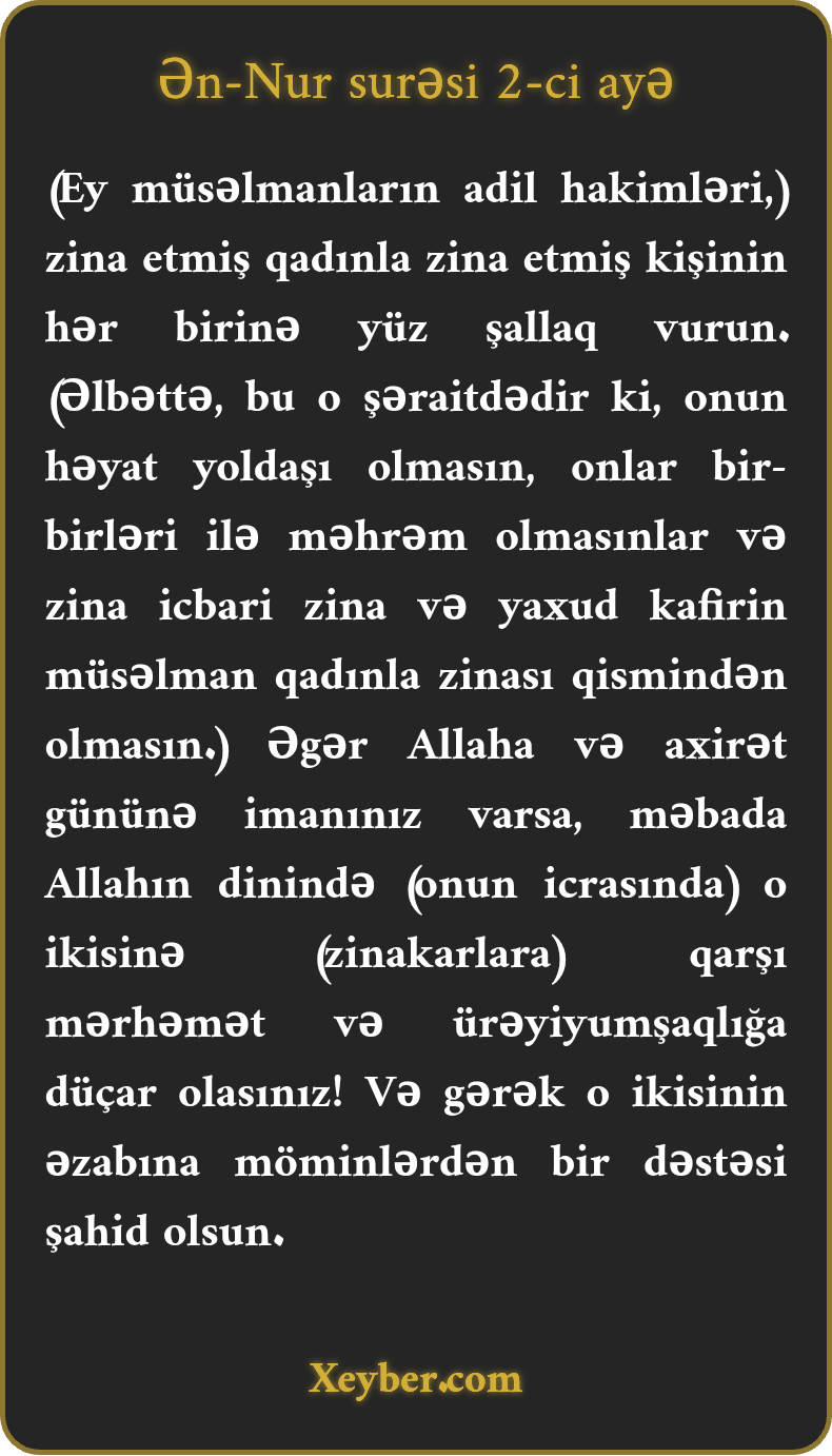 (Ey müsəlmanların adil hakimləri,) zina etmiş qadınla zina etmiş kişinin hər birinə yüz şallaq vurun. (Əlbəttə, bu o şəraitdədir ki, onun həyat yoldaşı olmasın, onlar bir-birləri ilə məhrəm olmasınlar və zina icbari zina və yaxud kafirin müsəlman qadınla zinası qismindən olmasın.) Əgər Allaha və axirət gününə imanınız varsa, məbada Allahın dinində (onun icrasında) o ikisinə (zinakarlara) qarşı mərhəmət və ürəyiyumşaqlığa düçar olasınız! Və gərək o ikisinin əzabına möminlərdən bir dəstəsi şahid olsun.