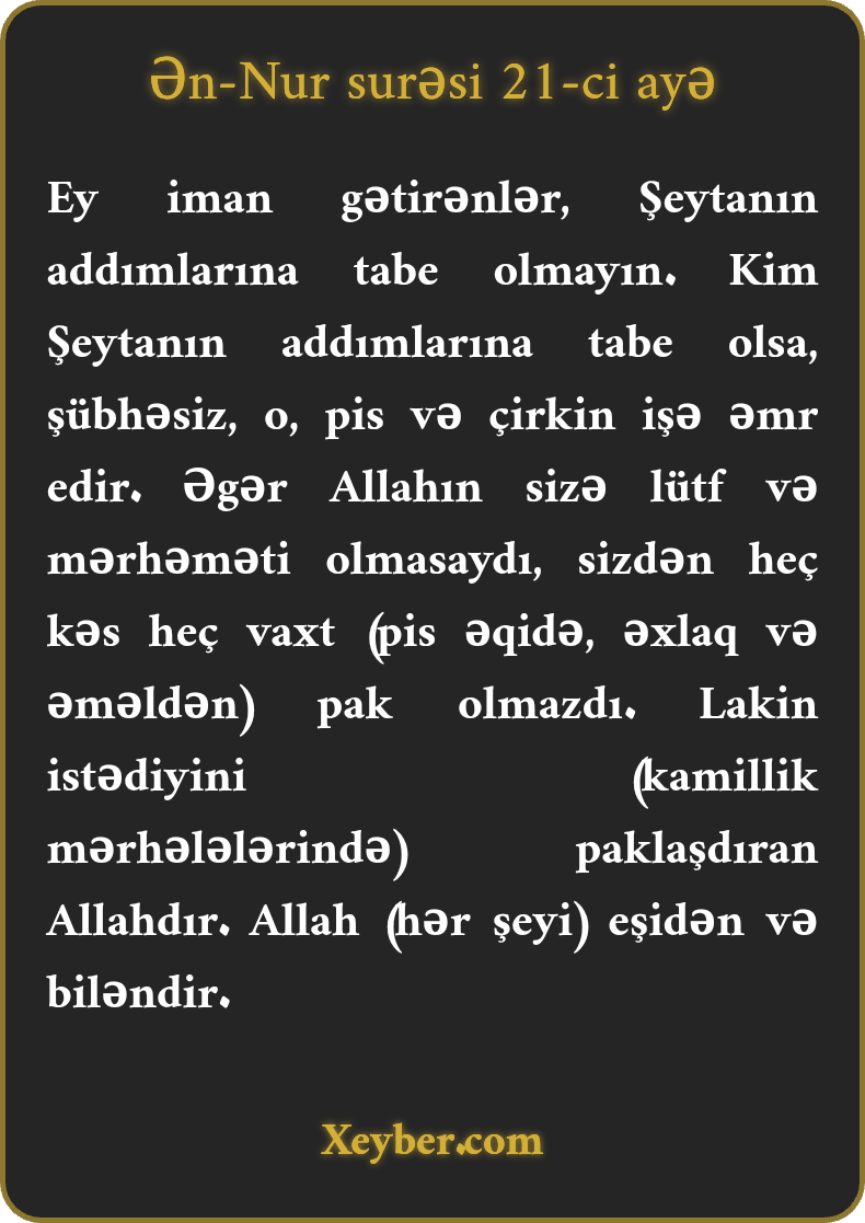 Ey iman gətirənlər, Şeytanın addımlarına tabe olmayın. Kim Şeytanın addımlarına tabe olsa, şübhəsiz, o, pis və çirkin işə əmr edir. Əgər Allahın sizə lütf və mərhəməti olmasaydı, sizdən heç kəs heç vaxt (pis əqidə, əxlaq və əməldən) pak olmazdı. Lakin istədiyini (kamillik mərhələlərində) paklaşdıran Allahdır. Allah (hər şeyi) eşidən və biləndir.