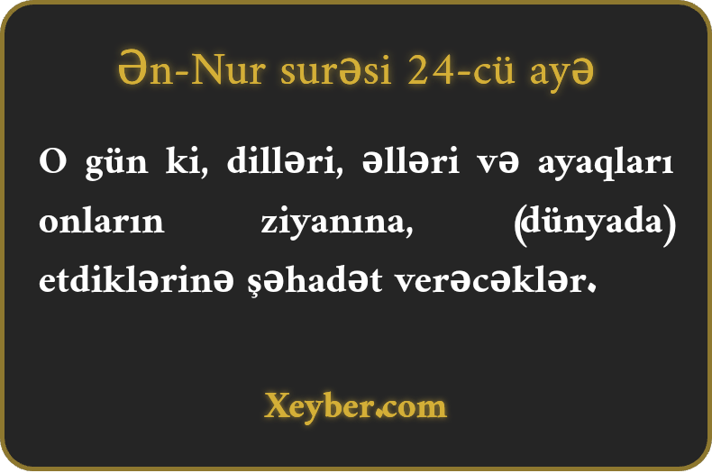 O gün ki, dilləri, əlləri və ayaqları onların ziyanına, (dünyada) etdiklərinə şəhadət verəcəklər.