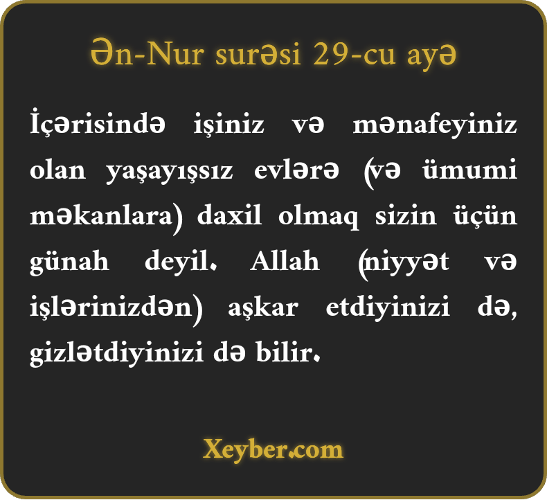 İçərisində işiniz və mənafeyiniz olan yaşayışsız evlərə (və ümumi məkanlara) daxil olmaq sizin üçün günah deyil. Allah (niyyət və işlərinizdən) aşkar etdiyinizi də, gizlətdiyinizi də bilir.