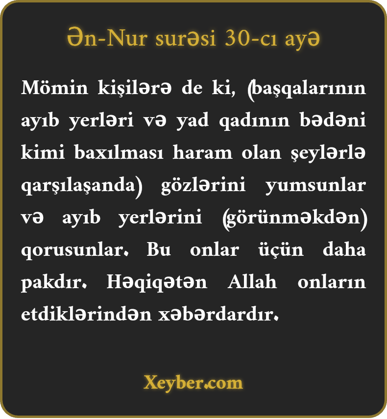 Mömin kişilərə de ki, (başqalarının ayıb yerləri və yad qadının bədəni kimi baxılması haram olan şeylərlə qarşılaşanda) gözlərini yumsunlar və ayıb yerlərini (görünməkdən) qorusunlar. Bu onlar üçün daha pakdır. Həqiqətən Allah onların etdiklərindən xəbərdardır.